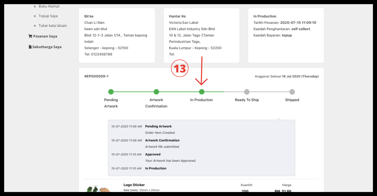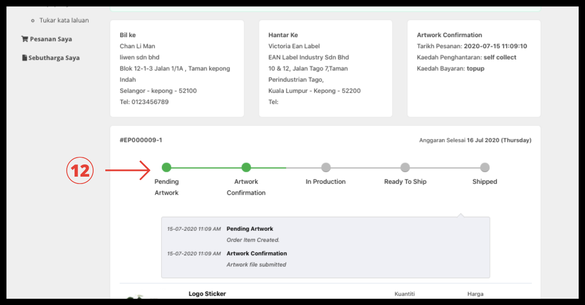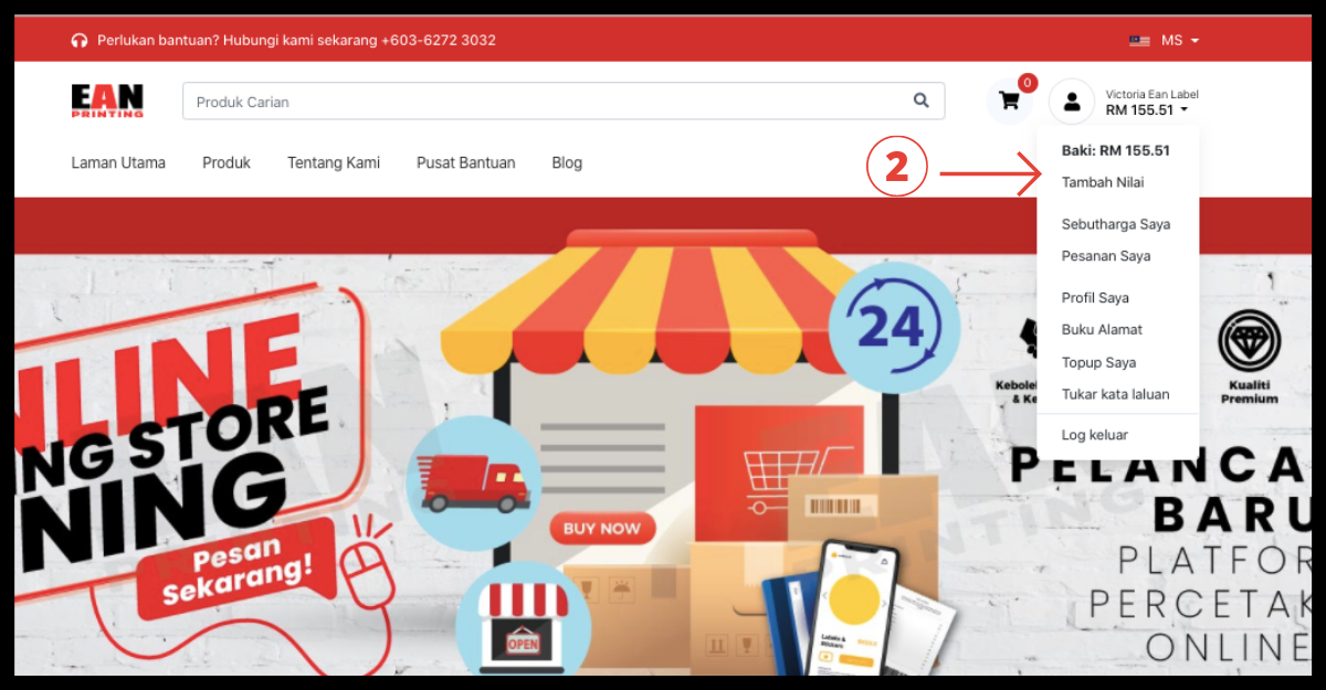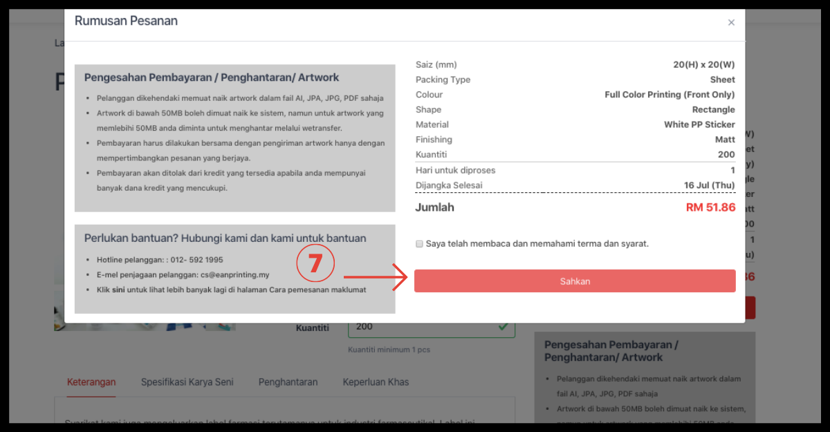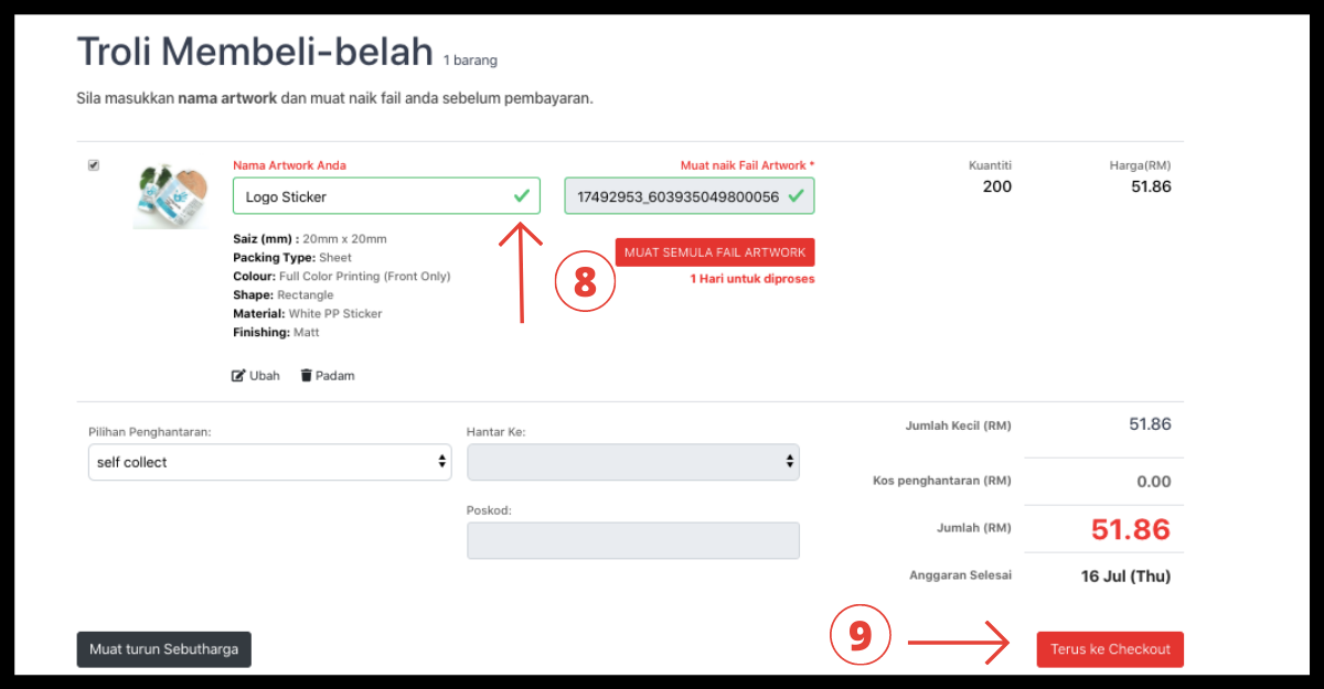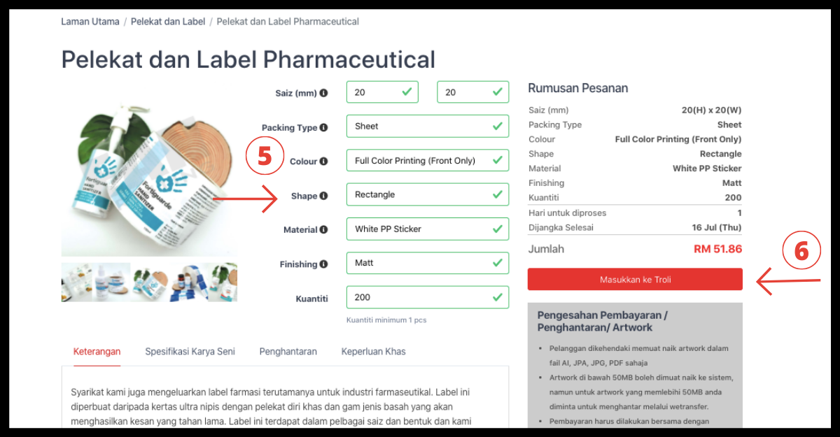 Langkah 5: Apabila selesai dengan pembayaran. Anda sekarang boleh membuat pesanan anda! Pergi ke produk dan isikan size(mm), packaging type, colour, shape, material, finishing dan quantity. Ringkasan Pesanan Segera akan ditunjukkan kemudian klik "tambah ke troli".