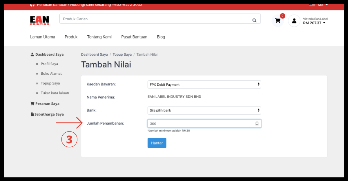 Langkah 3: Kemudian, pilih kaedah pembayaran anda melalui Transfer Antara Bank, Pembayaran Debit FPX, Tunai, Cek Bank masuk. Seterusnya, masukkan jumlah tambah nilai anda.