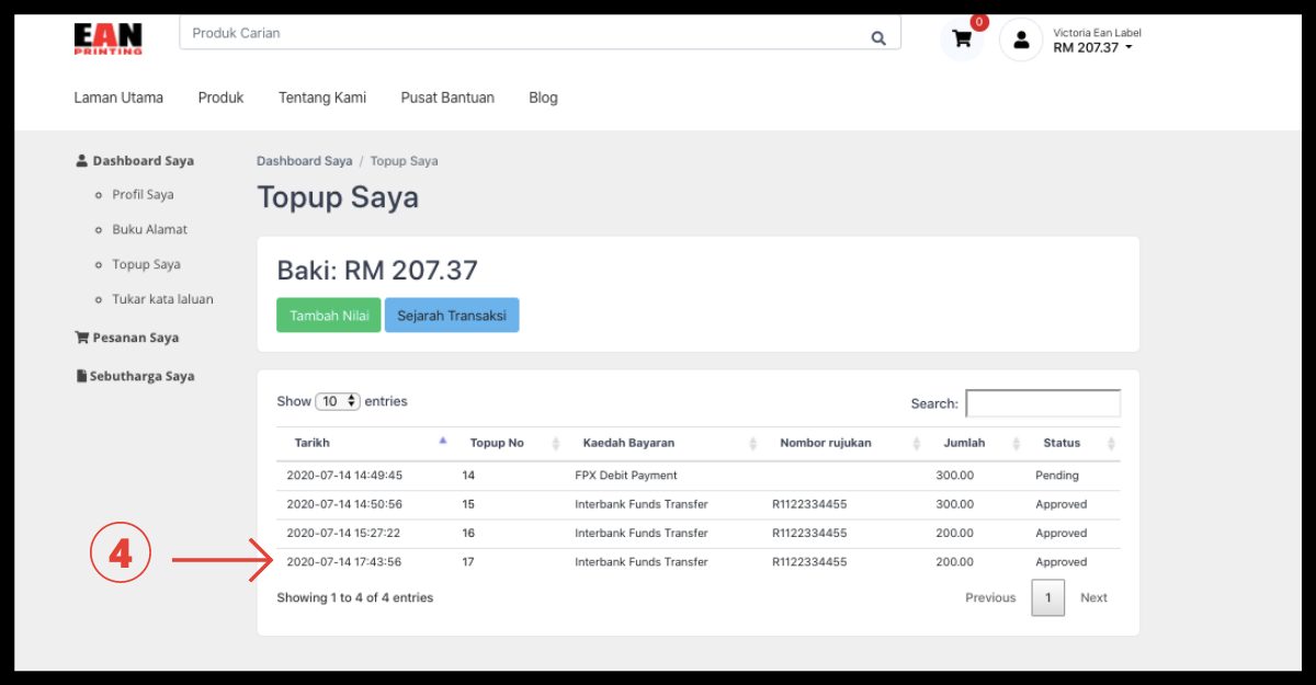 Langkah 4: Setelah selesai dengan pembayaran tambahan, pembayaran anda akan dalam status menunggu dan memerlukan 1-3 hari bekerja untuk mendapatkan kelulusan. Anda boleh menyemak status pembayaran anda di "Topup Saya". (Kemas kini status pembayaran anda akan dikirim melalui pemberitahuan e-mel)